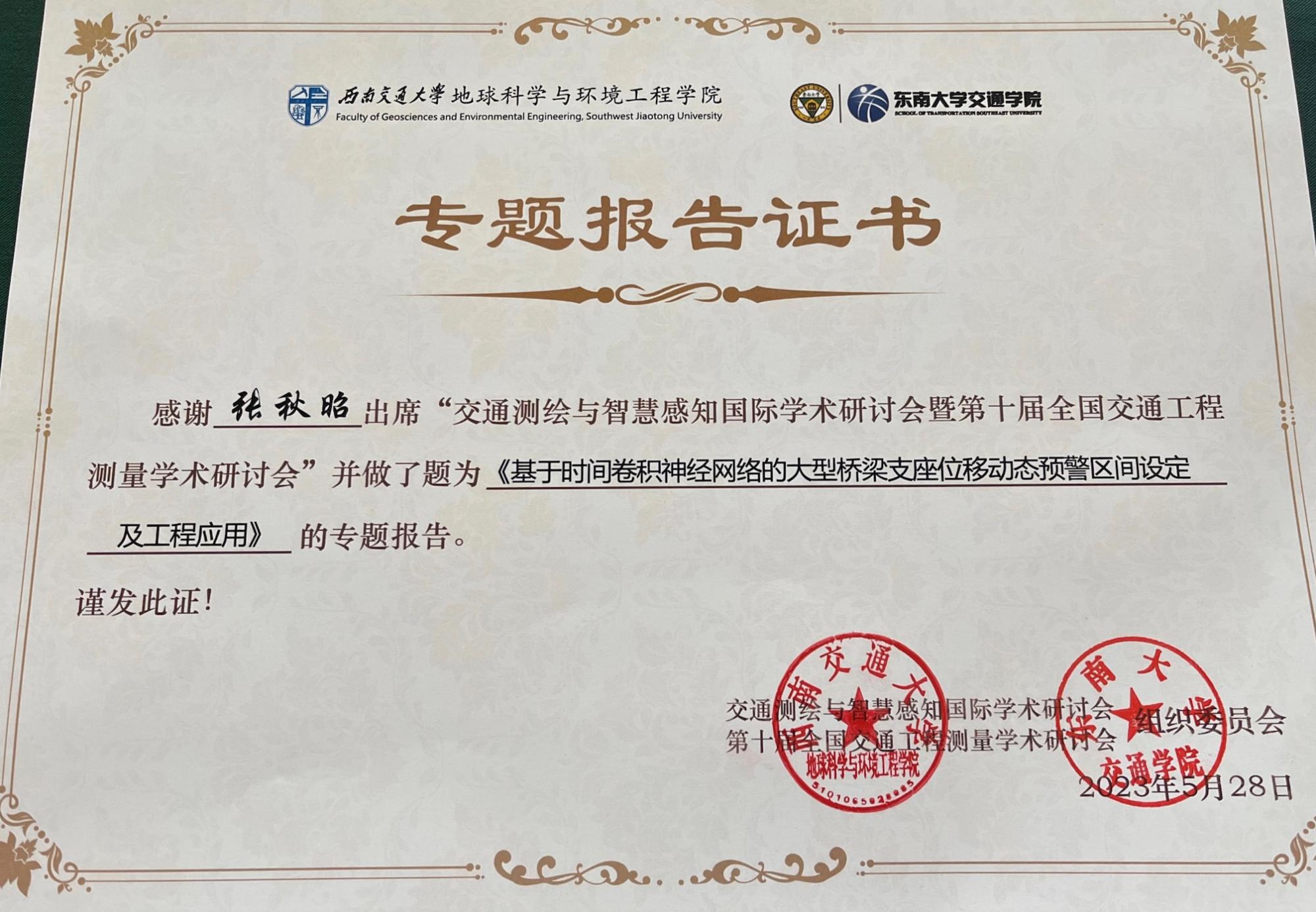 执行院长郑南山共同担任 “测绘新技术在交通工程中的应用”分会场专题主席。教授张秋昭、硕士研究生吴兆鹏受邀参加本次会议。