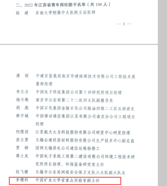 省重点实验室副主任李增科教授获得“2022年江苏省青年岗位能手”称号。