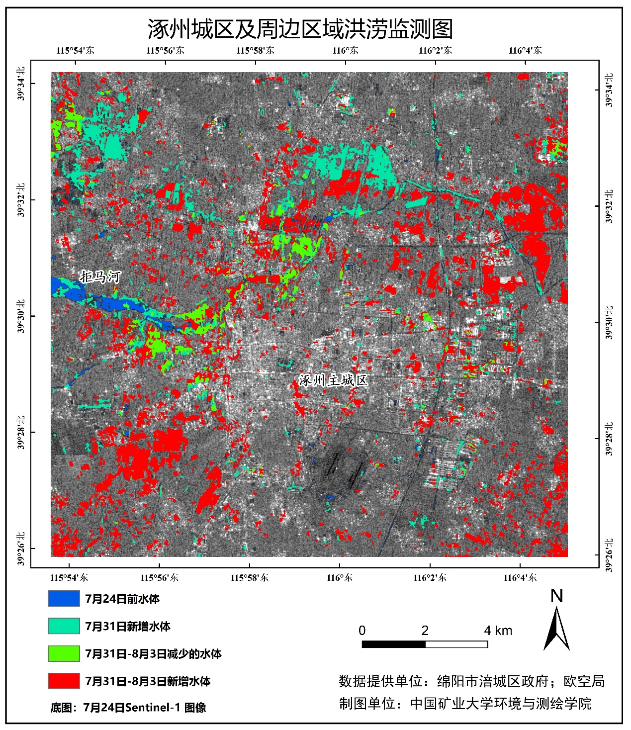 领导决定充分利用专业技术,为灾情提供及时的洪涝灾情监测资讯。副院长王潜心教授带领青年教师庄会富老师、研究生王鹏等人,紧急收集了覆盖涿州市的SAR影像数据(7月24日哨兵1号数据和7月31日、8月3日由“涪城一号”SAR卫星数据),如图1所示。并使用自主研发的数据处理软件对洪水影响进行了分析。结果表明:本轮强降雨以来,涿州市城区及周边地区的洪水情况有了明显变化,如图2所示。7月31日前,涿州市北部及西北部出现了大量的新增水体,而7月31日至8月3日期间,拒马河下游水体有所减少,但城区内部及其周围仍然存在大量水体。该数据揭示了涿州市当地近期持续不断的降雨以及来自上游的洪水,导致本次洪涝灾情十分险峻。当地政府应充分做好洪涝灾害防范工作,公众应加强防范意识,共同应对本次洪涝灾害。