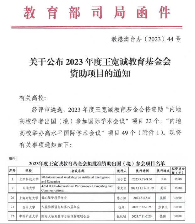 据悉,为促进中国内地高等教育机构与国(境)外进行合作与交流,王宽诚先生1985年出资一亿美元,在香港成立王宽诚教育基金会。基金会每年向教育部提供经费,资助中国内地高等教育开展各种交流项目。内地高校的71个项目入选王宽诚教育基金会2023年度资助项目,其中“内地高校学者出国(境)参加国际学术会议”项目22个、“内地高校举办高水平国际学术会议”项目49个。