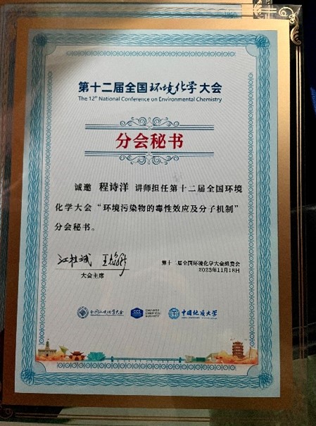 环境学科在新污染物代谢毒理研究工作中的学科声誉和影响力。环境学科教师程诗洋担任环境污染物的毒性效应及分子机制第47分会场秘书,为环境化学大会的会务组织工作做出了贡献。