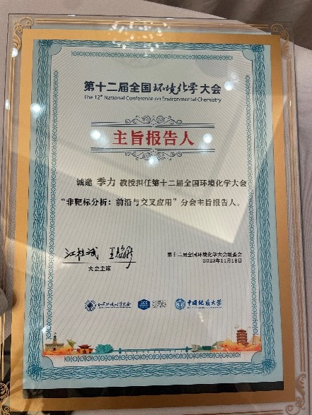 共同主办的第三届全国环境化学青年学者论坛,并在环境大数据会场作了邀请报告。11月19日上午,季力在第十二届全国环境化学大会非靶标分析-前沿与应用第四分会场受邀做主旨报告“发展De Novo方法揭示新污染物非共识代谢的毒理学图谱”,汇报了其近期在新污染物阻燃剂、抗生素、精神活性药物等代谢研究中所产阐明的多个新型代谢路径,得到了国内诸多新污染物研究一线科研人员的肯定,提升了直播露点