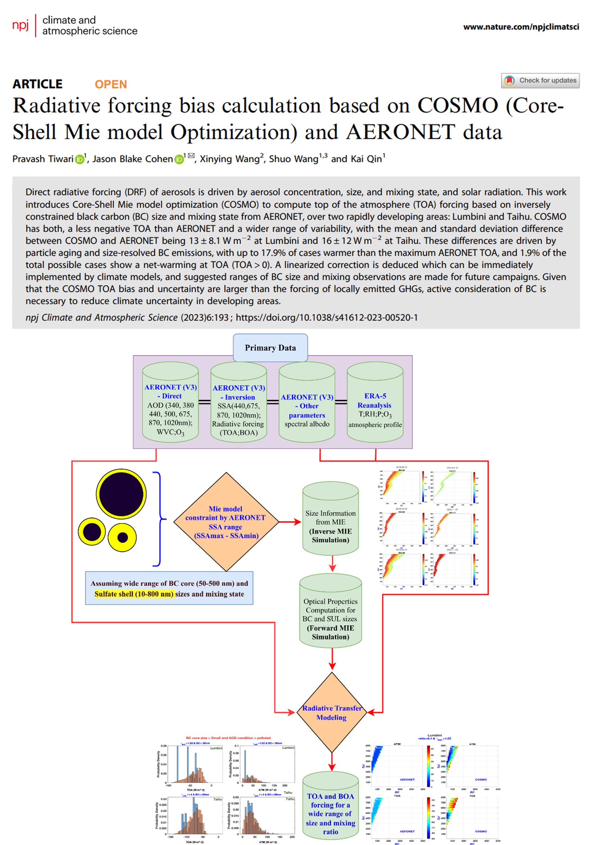 Jason Cohen教授指导博士生Pravash Tiwari在《Nature》旗下顶级期刊npj Climate and Atmospheric Science发表吸光气溶胶辐射强迫不确定性估算最新研究成果,提出了一种基于“核-壳”假设的MIE散射辐射模型优化方法,并引入地基气溶胶遥感网络AERONET数据反演了吸光气溶胶的尺寸和混合状态,进而计算了Lumbini和太湖两个快速变化区域的大气层顶辐射强迫。该研究为后续使用卫星遥感技术量化煤尘和化石能源燃烧排放黑炭的辐射效应奠定了基础。