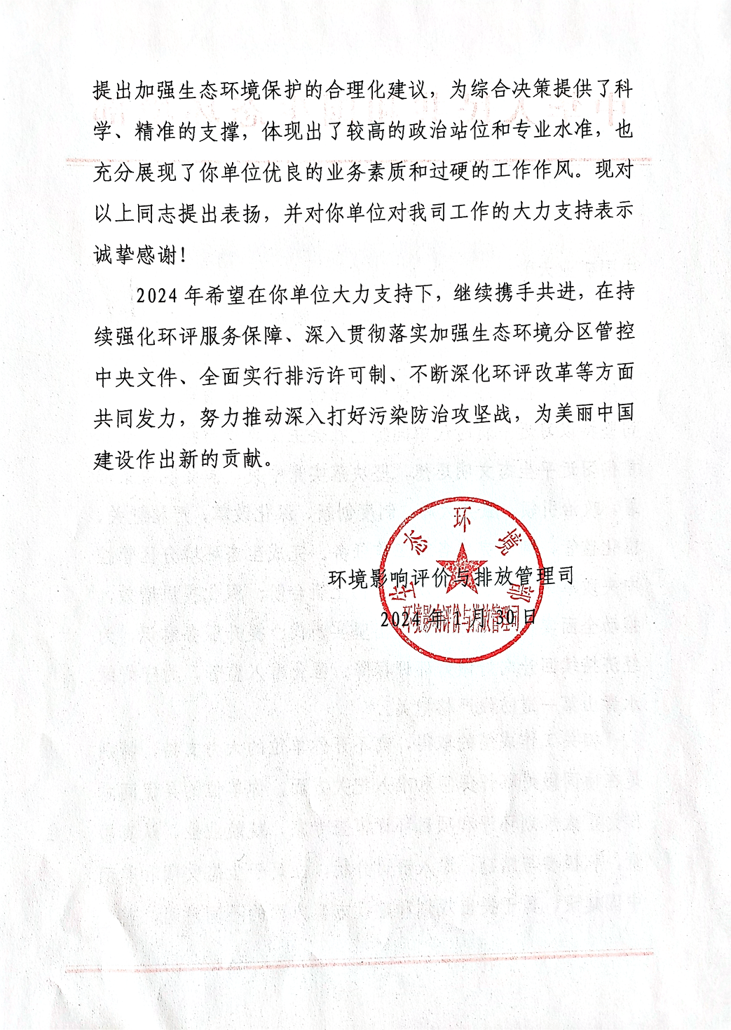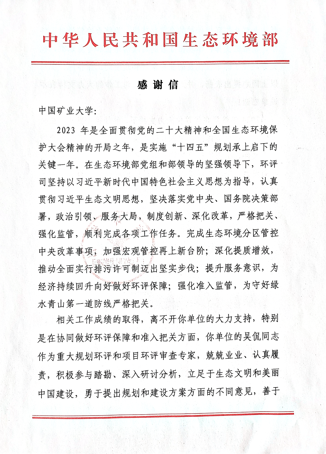 近日,生态环境部环境影响评价与排放管理司向直播露点 发来感谢信,感谢2023年直播露点 对生态环境部相关工作的大力支持。信中提及在协同做好环评保障和准入把关方面,直播露点 吴侃教授作为重大规划环评和项目环评审查专家,认真履责,勇于提出规划和建设方案方面的不同意见,善于提出加强生态环境保护的合理化建议,为综合决策提供了科学精准的支撑。